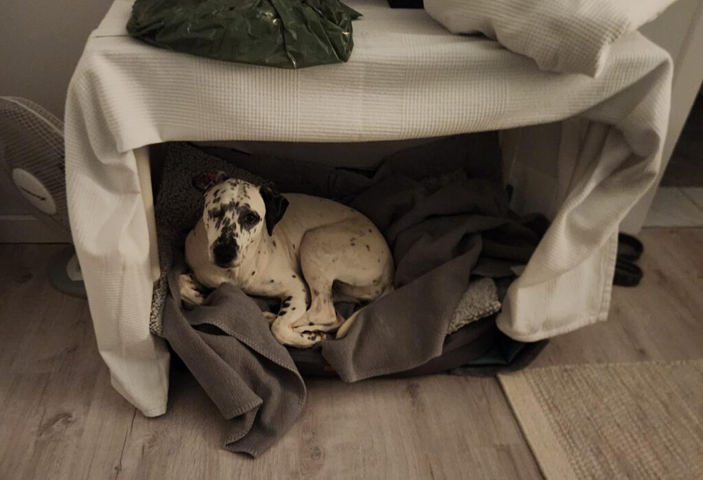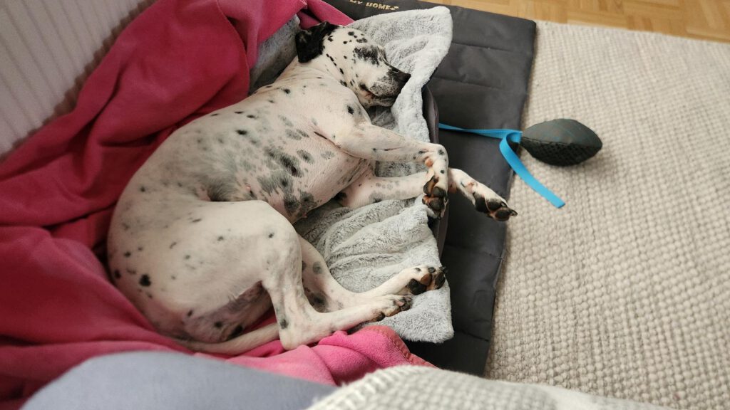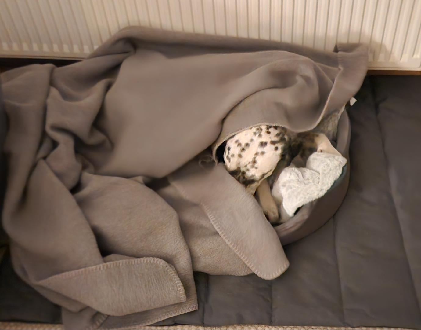 In der Nacht schlief sie in ihrer „Höhle“ neben meinem Bett bis 7:30 völlig ruhig und entspannt. Das war auch in der folgenden Nacht so. Stubenreinheit klappt auch super, sie zeigt gut an, wenn sie raus möchte.